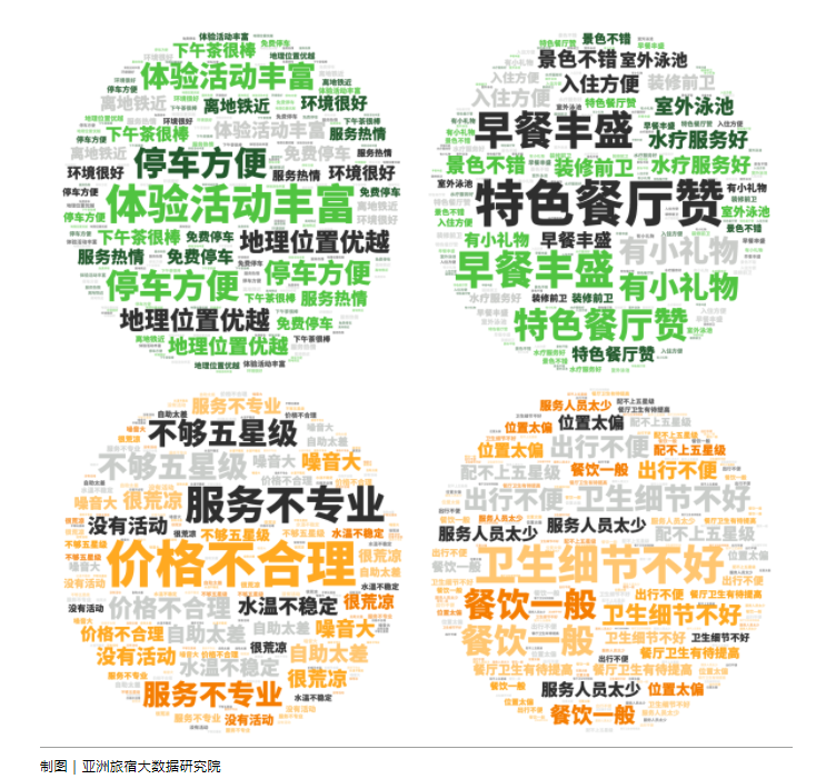 根据亚洲旅宿大数据研究院发布的《2022中国酒店点评报告》显示,在酒店差评关键词中占比最大前三名分别是“卫生太差”、“管理混乱”、“配不上五星级”等。在好评关键词当中前三名则是“特色餐厅赞”、“水疗服务好”、“设备服务好”等。