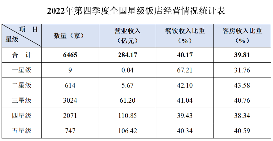 《全国星级旅游饭店统计调查报告》显示,2022年第四季度,共有6465家星级旅游饭店的统计数据通过省级文化和旅游行政部门审核。其中,五星级饭店747家、四星级饭店2071家、三星级饭店3024家、二星级饭店614家、一星级饭店9家。