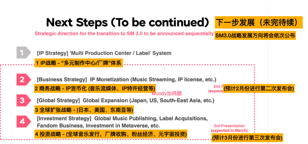 在视频声明中,二人也提到了未来SM的战略规划:李秀满建立的总制作人制度不复存在,公司将分为多个制作中心+外部厂牌运营。而且接下来的2-4季度,SM计划一口气推出3-4个新组合。