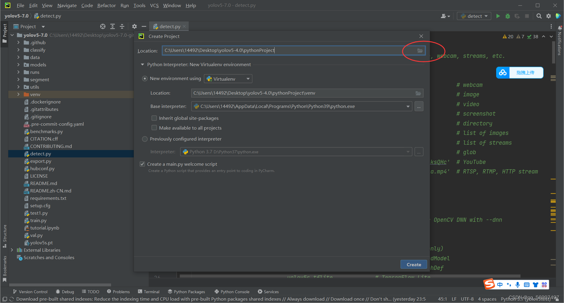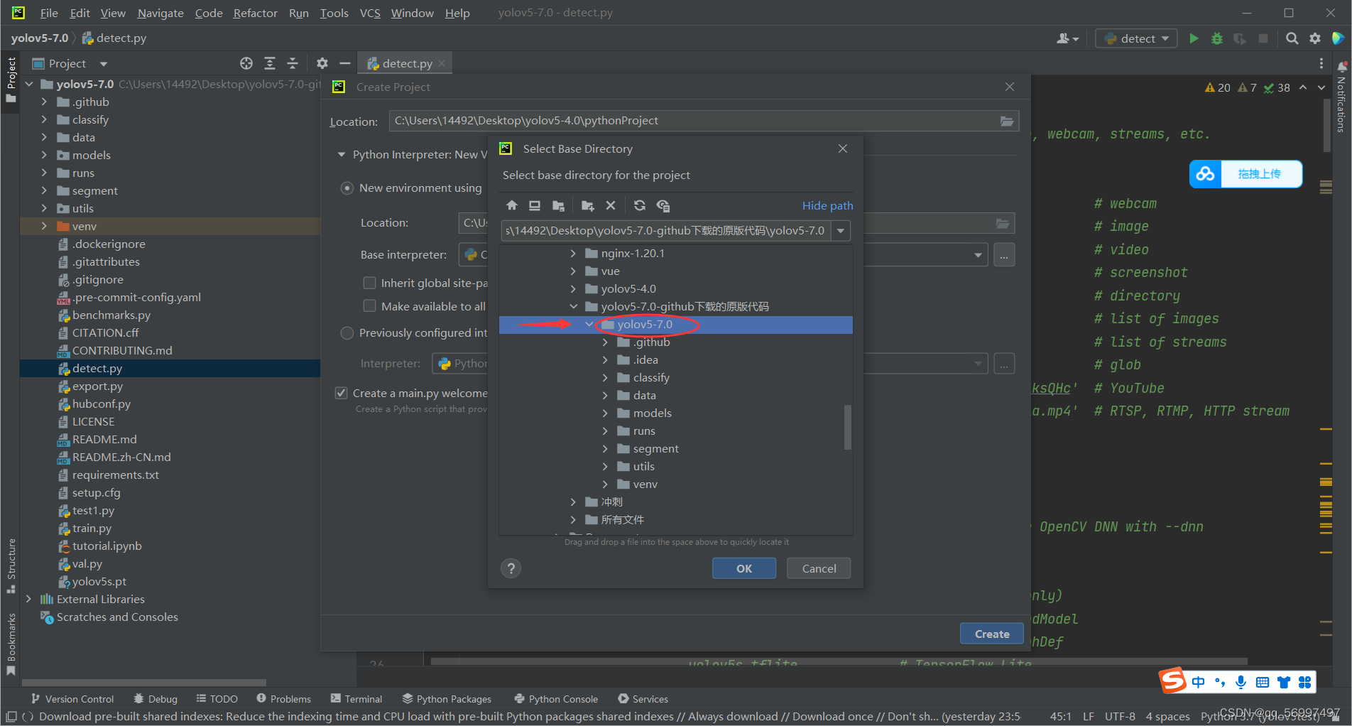 安装好pycharm后,打开软件,点击File->New project,在打开的界面中点击文件图标选择百度云上你下载yolov5文件夹所在目录,注意要选中次级目录,之后点击OK。