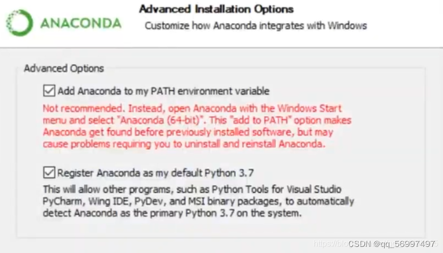!!!重点,首选根据从百度云中下好anaconda安装包后,勾选这两项方便环境配置,如果安装时没有勾选这两项建议重新安装,并!重!启!,涉及到环境变量的改动都建议在修改后重启。