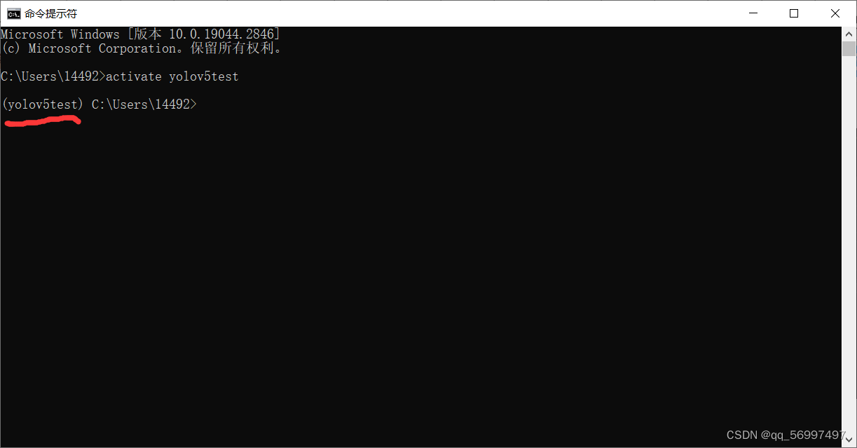 然后输入activate yolov5test进入环境目录下,在输入下面的代码后回车
