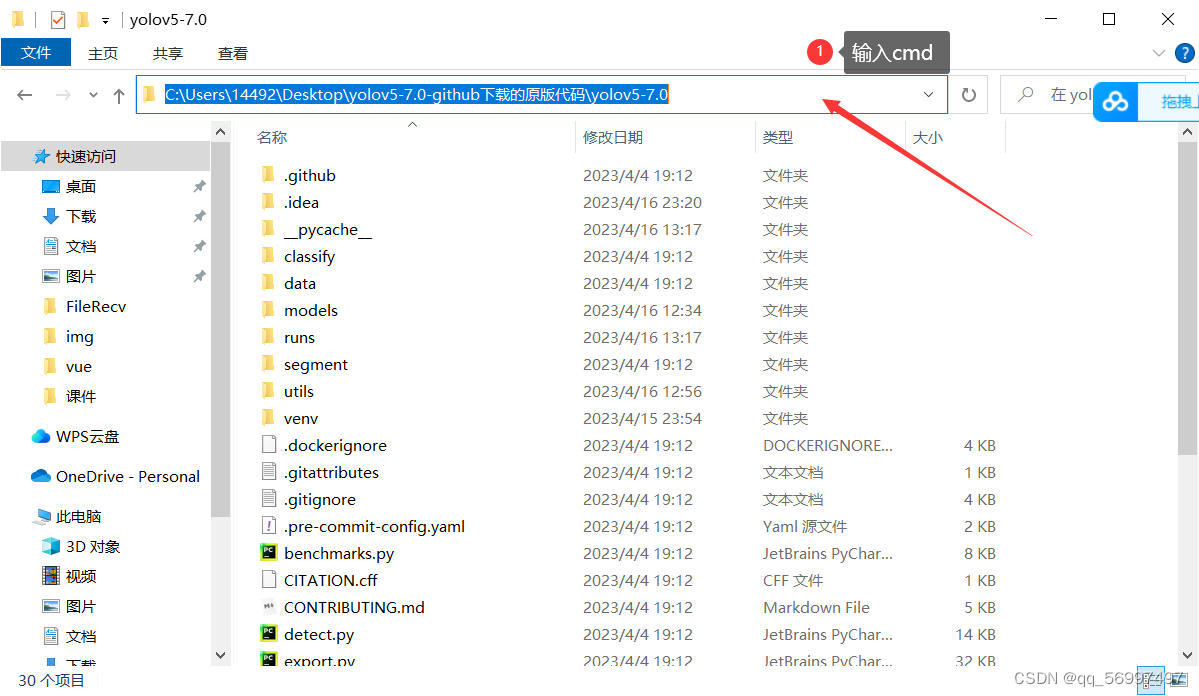 其他库的安装根据requirement.txt文件安装,首先打开yolov5文件目录如下图所示,然后在文件路径全选输入cmd,就进入此文件路径的cmd