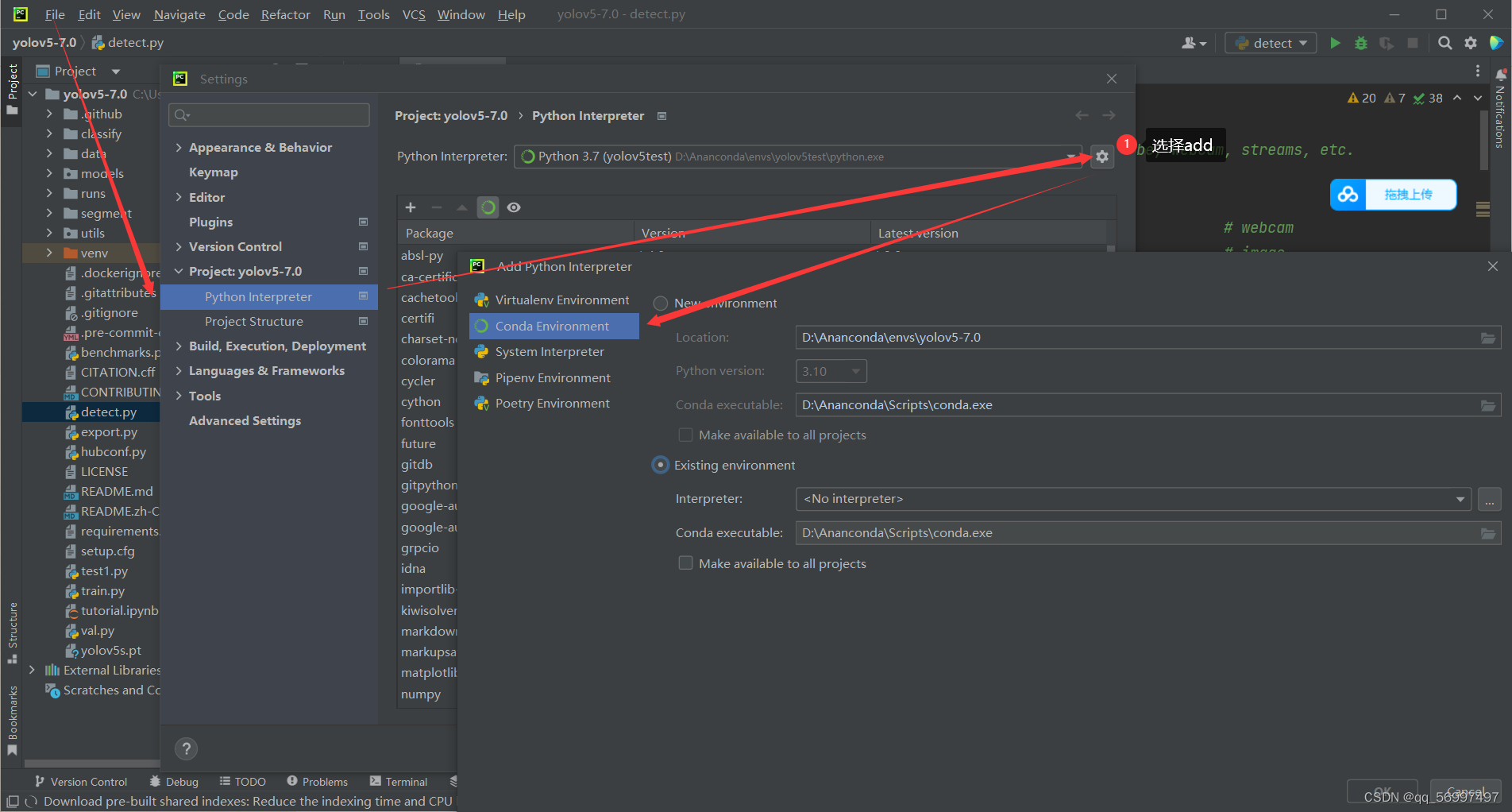 之后进入pycharm中点击File->settings,按如图操作选择工程所需的interpreter,最后点击ok