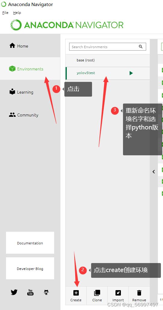 安装好anaconda后,点击菜单栏中anaconda Navigator,点击environment,注意!!!将新环境命名为yolov5test(下面进入环境需要用到),python版本选择python3.7,点击ok,等待自动生成初始环境,之后即可关闭anaconda。