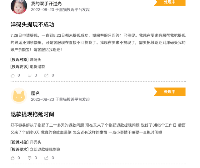 在社交平台,及相关投诉平台,大量的用户表示,在洋码头提现日常困难,一直都是无限期的拖延状态。