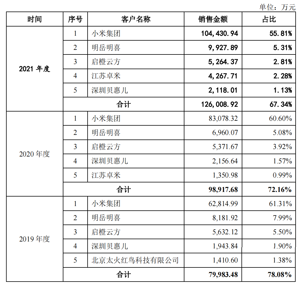 公司的产品分为自有品牌和小米定制的米家品牌,其中自有品牌以“素士” 为主,此外还有“品敬”、“AIRFLY” 等。从收入来看,2019-2021年小米一直是其第一大客户,公司来源于小米收入分别为6.3亿元、8.3亿元及10.4亿元,占比分别为61.3%、60.6%和55.8%。也就是说公司的客户集中度极高,并且报告期内素士与小米的关联交易均超过五成。