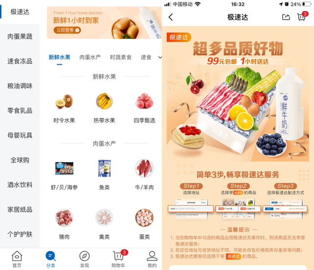 其前置仓大约200300平米,SKU一般不超过1000个,均为精选会员高频次购买和高渗透率的商品,包括生鲜、母婴、个护、干货,以及网红爆款休闲零食类商品,为周边35公里的用户提供1小时的“极速达”服务。