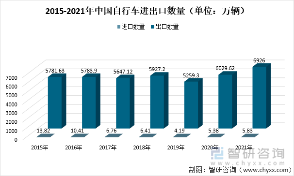 2021年中国自行车进口数量为5.83万辆,同比增涨8.32%;出口数量为6926万辆,同比增长14.87%。其中,2021年1-12月中国共出口自行车出口金额约330亿元,同比增长31.0%。