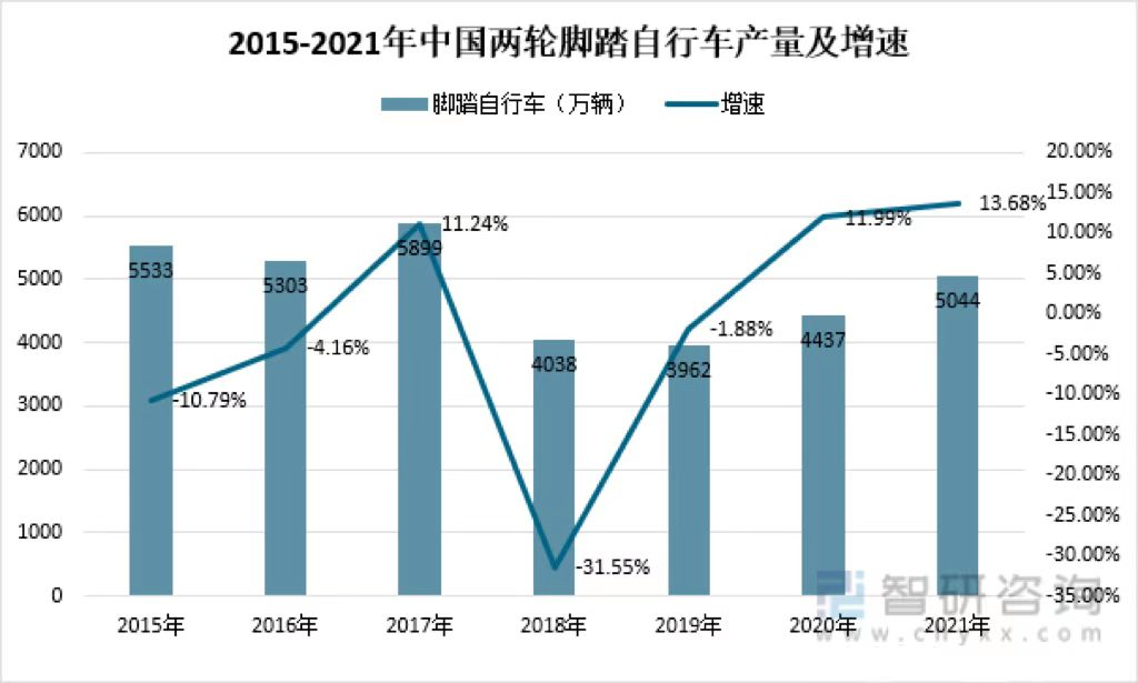 根据智研观点数据显示,2021年中国两轮脚踏自行车累计产量为5043.8万辆,同比增长13.68%。