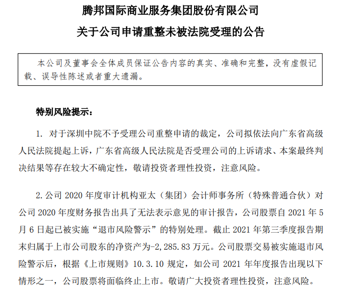 值得关注的是,在此次被宣布强制退市前,腾邦国际还向法院提交了破产重组的申请。5月19日,腾邦国际公告,公司收到广东省深圳市中级人民法院裁定,驳回公司重整申请,公司未能进入破产重整程序。