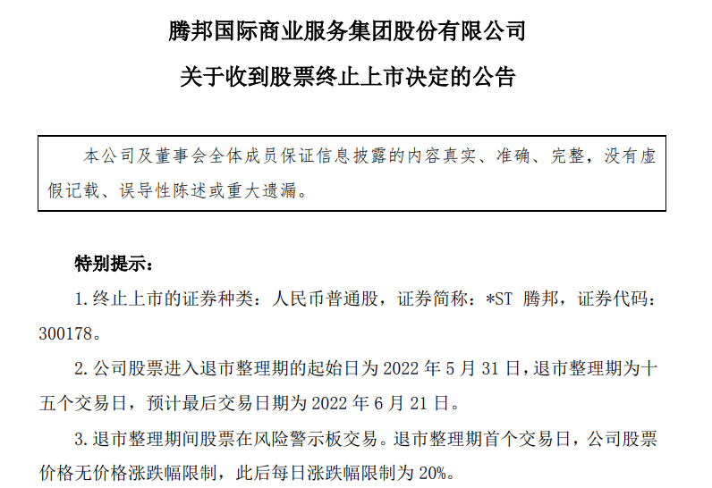时间回到5月24日,腾邦国际发布公告称,收到深交所《关于腾邦国际商业服务集团股份有限公司股票终止上市的决定》,自5月31日起,腾邦国际股票进入退市整理期。