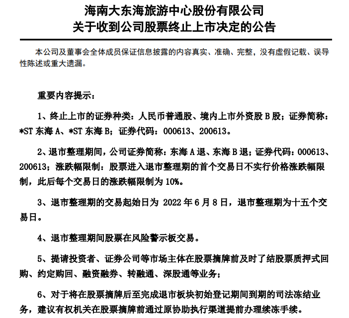 就在腾邦国际宣布进入退市整理期不久后,*ST东海A也发布公告表示收到深交所下发的《关于海南大东海旅游中心股份有限公司股票终止上市的决定》,公司股票被深交所决定终止上市。