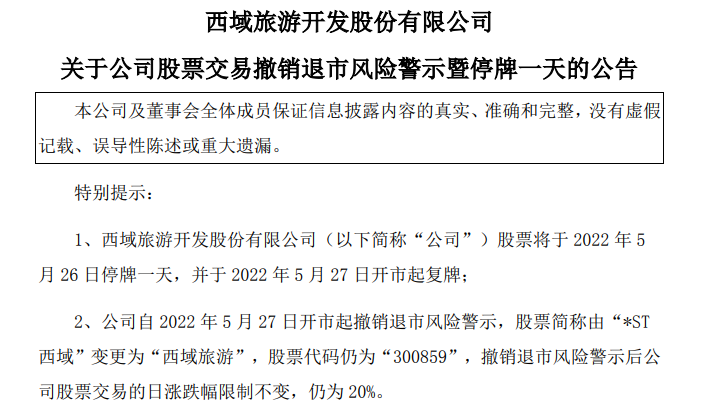 最新消息显示,随着疫情得到有效控制,西域旅游业务逐步恢复正常,在2021年其实现营收1.49亿元,净利润达2695万元,证明了自己的经营没有问题,终于在5月27日撤销退市风险警示,给自己摘掉了帽子。