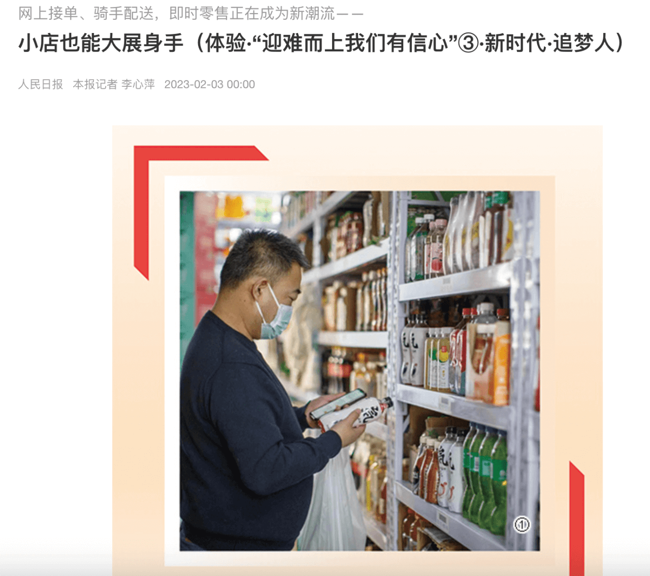 2月3日,人民日报在一篇文章中介绍了北京一家小超市的店主郑明月的亲身经历。通过大数据生成消费者画像和选品建议,仅用17天,郑明月就将一家有着近5000种商品的超市开起来了。利用智能动线规划,店员能在2分钟内分拣完30件商品并打包交给外卖骑手。