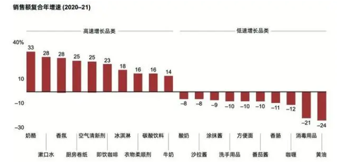 贝恩公司与凯度消费者指数联合发布的《2022年中国购物者报告之中国快速消费品》显示,虽然疫情期间使消费者对营养需求更加重视,带来乳制品销量提升,但酸奶销售额却出现了下滑。2020到2021年,牛奶取得了14.7%的销售额增长,奶酪增速更是高达33%,然而酸奶的销售额下降了7.8%,被列为低速增长品类。