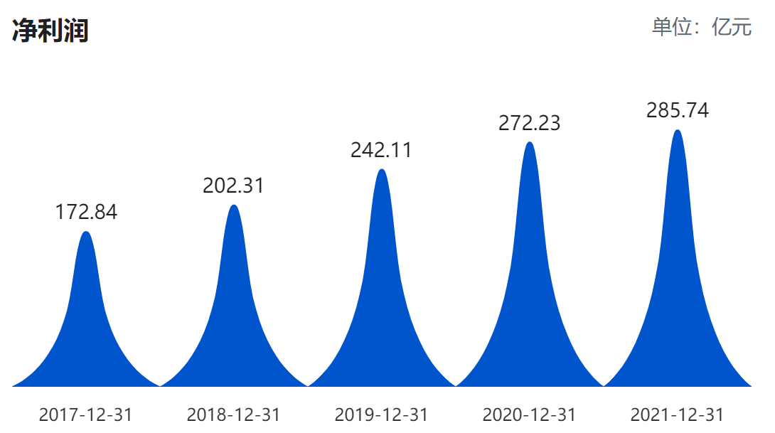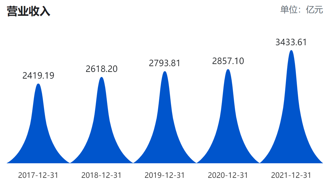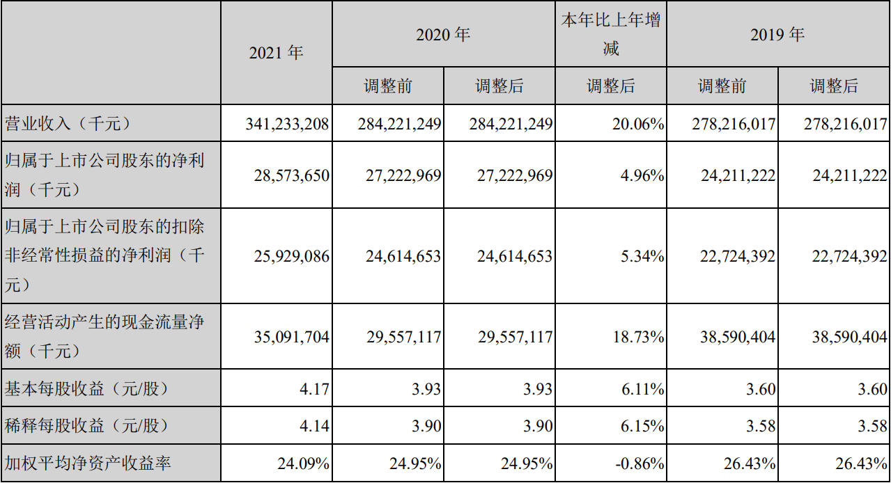 2021年营收3412亿,同比增加20.06%,净利润259亿,同比增长5.34%,经营现金流净额351亿,同比增长18.73%,加权平均净资产收益率24.09%,同比下降0.86%。