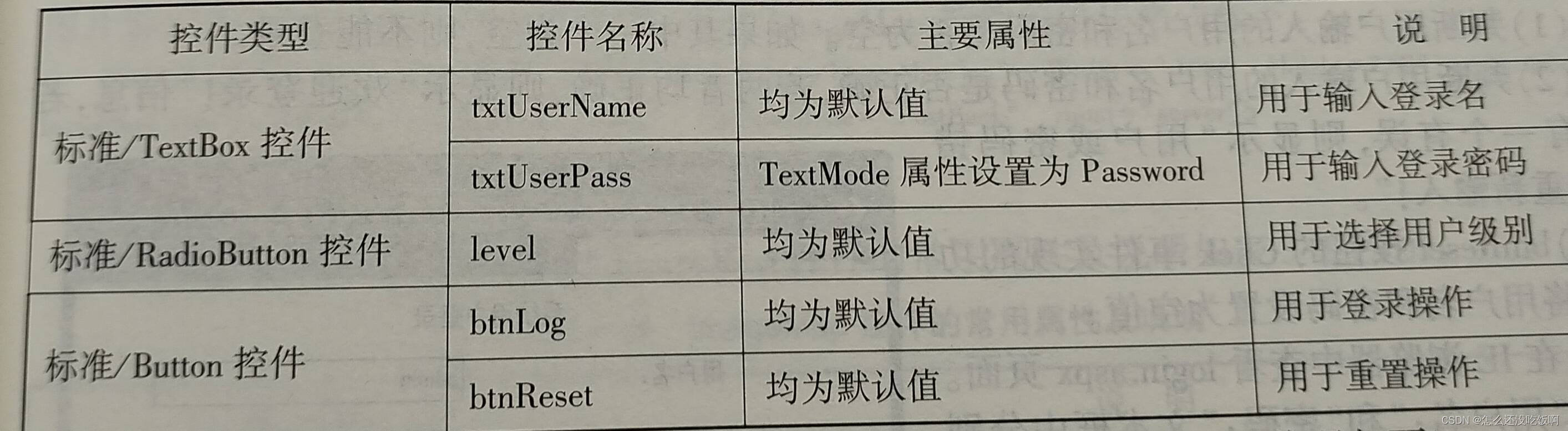 login.aspx窗体中添加控件,所添加的控件类型,控件名称,添加这些控件,textbox:用于输入登录名;用于输入登录密码,RadioButton:用于选择用户级别