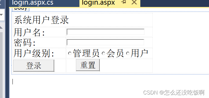 这里是可以设计的 ,直接拖控件用户登录系统,用户名,密码,用户级别,用户可以通过选择来进行自己的身份,利用C#写if语句判断用户名和密码在进行是否可以登陆成功。