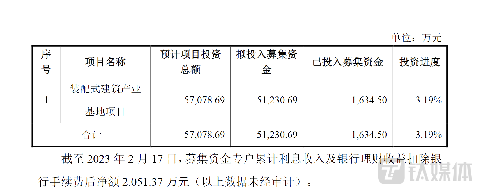 更加有意思的是,中装建设上述募集的5.25亿元本来主要用于装配式建筑产业基地项目。截止到2022年2月,该项目已投入募集资金3634.50万元,投资进度为7.09%。然而,到了2023年2月,中装建设表示装配式建筑产业基地项目的投入金额为1634.5万元,进度条为3.19%。这不禁让人产生疑惑,1年的时间,中装建设是如何做到将已经在该项目上多投的2000万元 “收”了回去,同时,该项目的投资进度也由7.09%降低至了3.19%?