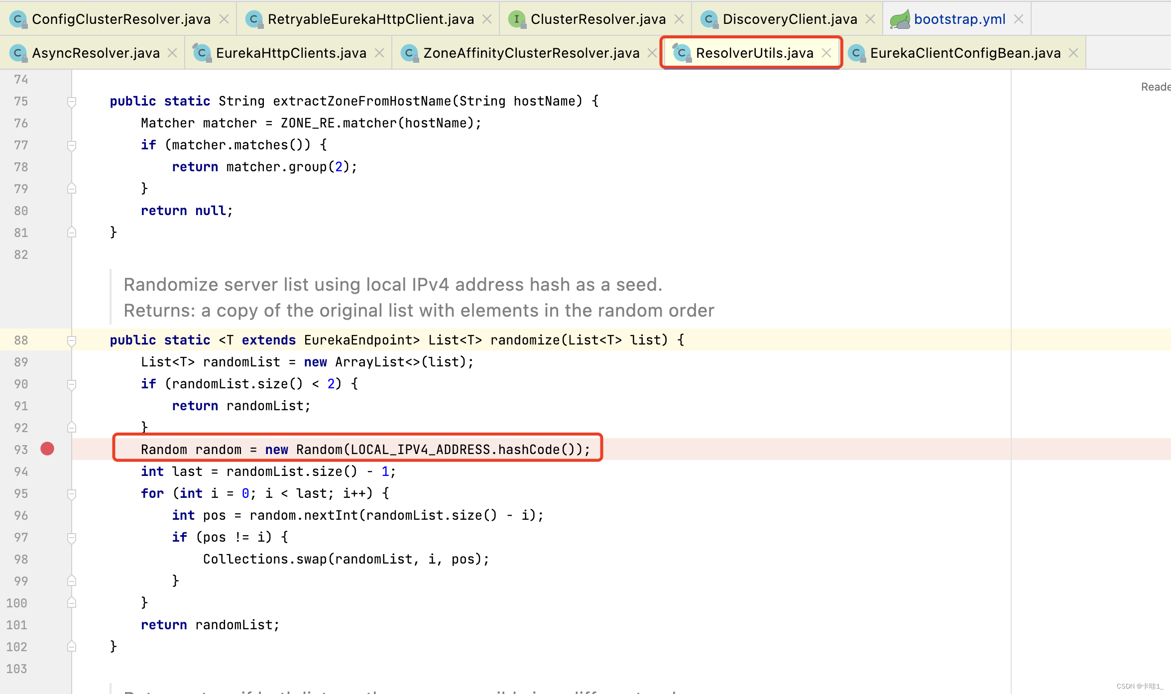 defaultZone配置多个的时候,源码里面是会根据本机的ipv4硬件地址做一个随机数,将多个ip进行随机交换swap。
