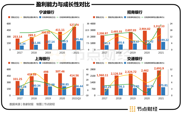 高关注、高评级得益于宁波银行的成长性较行业更高。我们选取五大行之一的交通银行、股份制龙头招商银行与同属区域性银行龙头的上海银行做比较,可见股份制商业银行与区域性商业银行的成长性显著好于国有大行,这必然也是估值差异的主要原因之一。