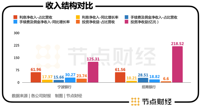 宁波银行向投资银行性质的转型或更前进,投资收益贡献明显,2021年占比高达23.74%,而招商银行仅为6.6%。多元化业务的推进助其市值长效成长。非息业务贡献总体呈增加趋势。利息收入对收入的贡献与招商银行不相上下,均为61%+,增长率快于招商银行。手续费及佣金净收入尽管增长较快,但占比较低。