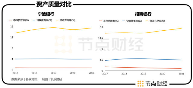 宁波银行的资产质量、对风险的防范能力较强,但也有可进步的空间。虽然其的不良贷款率一直保持在很低的水平,收回贷款的风险极小,但资本充足率常年低于招商银行两个点,招商银行能够承受违约资产风险的能力更胜一筹。