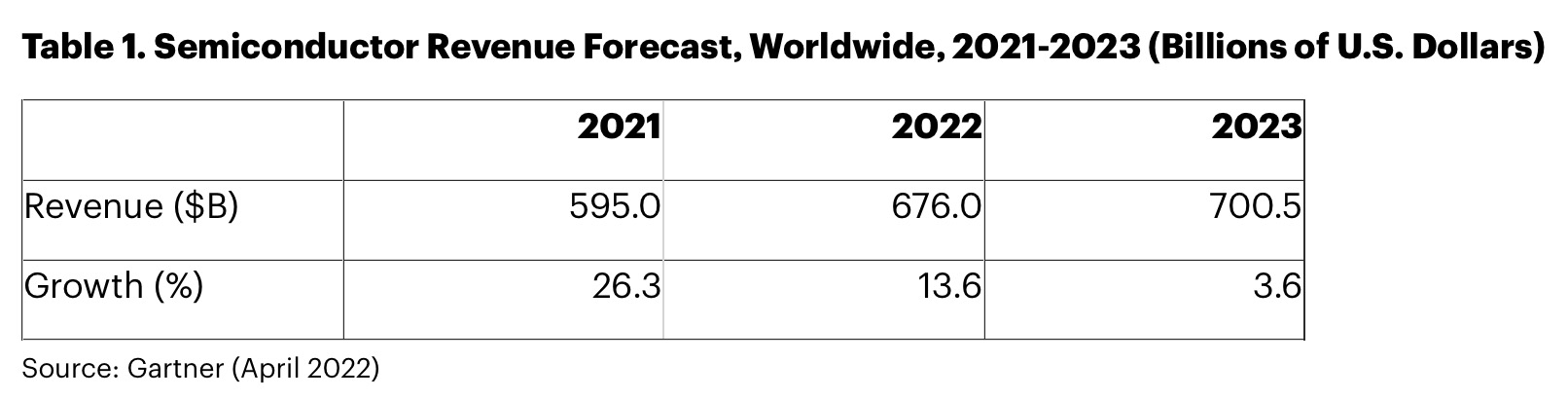 过去几年,在人工智能、云计算等技术推动下,信息科技得到迅猛发展,继而进入AIoT时代,由此各界对芯片需求剧增。尽管全球面临供应紧张,但全球半导体市场依旧维持稳健增长态势。根据权威调研机构Gartner的数据显示,2021年,全球半导体收入达到5950亿美元,同比增长26.3%,2022年预计将增长至6760亿美元,同比增长13.6%。当然,全球半导体市场收入稳增的驱动力在于芯片短缺中提高了半导体平均售价。