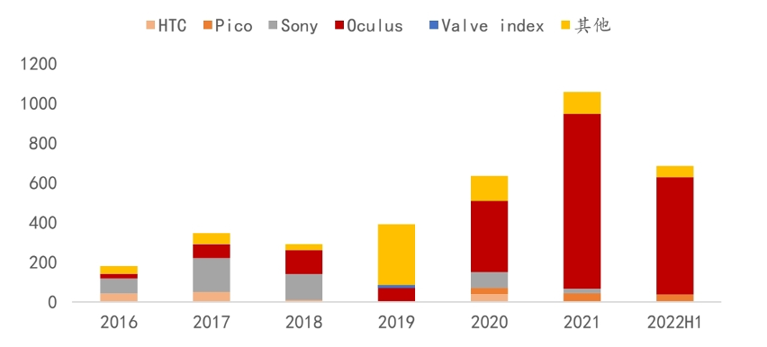 2016-2022H1 全球主要VR头显出货量分布图源IDC、VR陀螺、国联证券