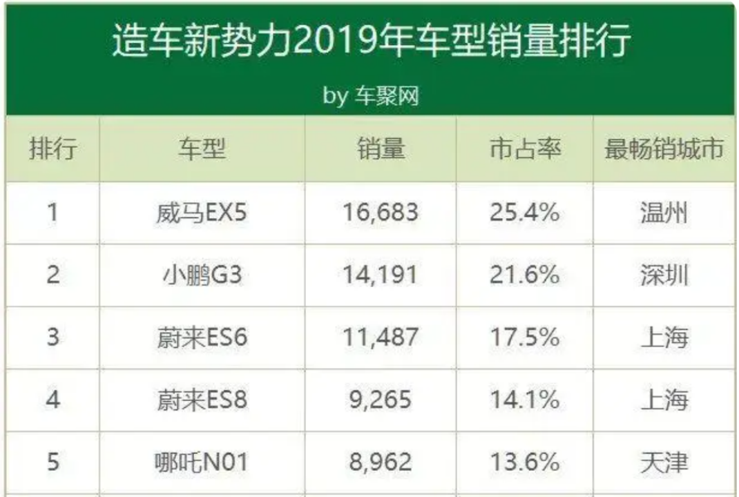 与小鹏一样,威马在初期的产品市场视野放在了B端。威马建立了大雁出行APP作为网约车品牌,期望借助B端渗透的方式,让网约车司机和乘客体验到产品魅力。2019年,威马EX5单车销量达到16883辆,拉开其他新势力一大截。