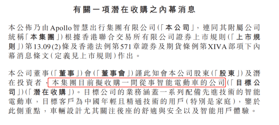 12月5日, Apollo出行披露了《有关一项潜在收购之内幕消息》的公告。公告显示,Apollo出行目前拟收购一家从事智能电动车的公司。目标公司的业务涵盖一系列配备先进技术的智能电动车。