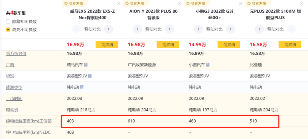 与对标车型小鹏G3、埃安Y、比亚迪元EV PLUS相比,威马EX5的续航里程是最小的。在辅助驾驶、车载智能系统、车载智能芯片的智能化角度上,相比其他三家,也存在感很弱。作为一款必须要与传统燃油车拉开差距的纯电车,这样的配置让消费者也“没得选”。
