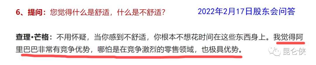 在2022年2月17日举行的Daily Journal年度股东大会上,查理·芒格在回答投资人关于投资阿里巴巴出现巨大浮亏的问题时,回答说:
