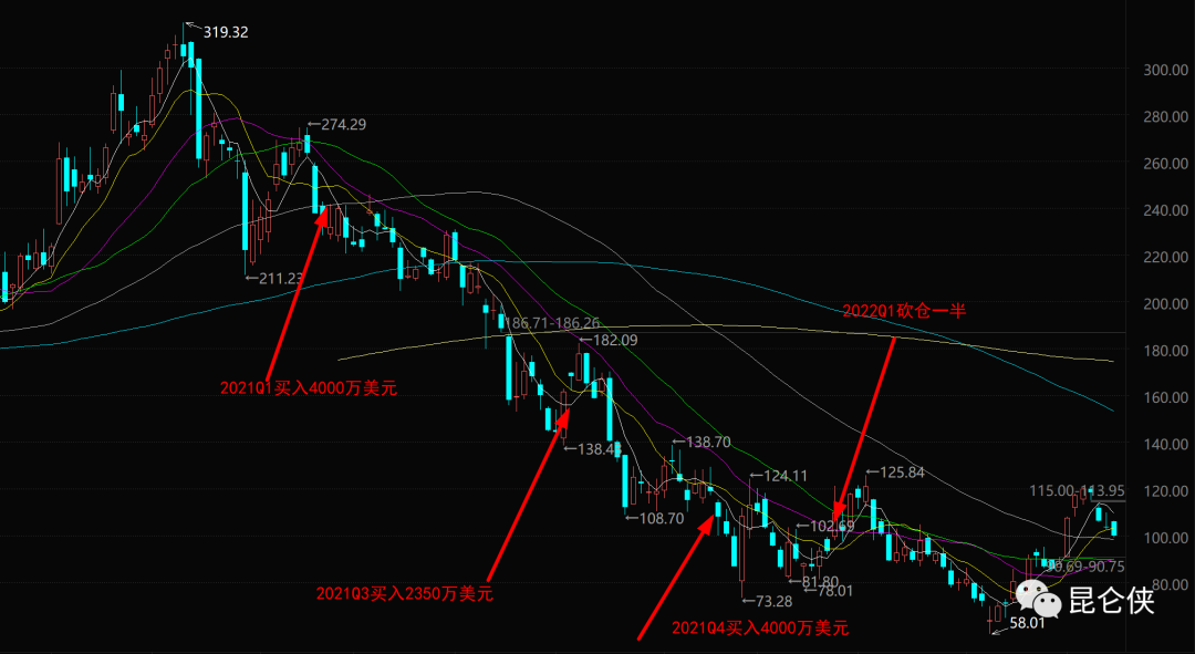 2021年三季度阿里股价继续大跌,芒格加仓13.67万股,均价170元左右,2021年四季度买入30万股,均价133元左右。
