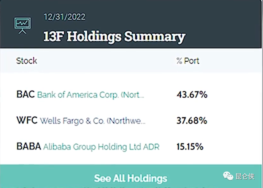 根据最新披露的Daily Journal在2022年底的持仓数据显示,阿里巴巴持仓比例为15.15%,位列第三大持仓,而排名第一和第二的分别是美国银行和富国银行。前三大持仓股合计占比96.5%。持股集中度非常高!