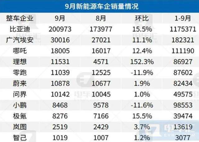 国内的新能源汽车正卖得越来越好。据统计,9月份销量超过一万的国内新能源汽车品牌有7家,按照销量从高到低排列,分别为:比亚迪、埃安、哪吒、理想、零跑、蔚来和问界。