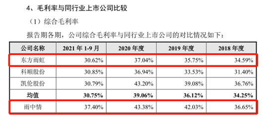此外,雨中情报告期内实现的利润还存在一些疑点。招股说明书显示,报告期内,雨中情的毛利率分别为36.65%、42.03%、43.48%、37.4%,同行可比公司均值分别为34.25%、36.12%、39.06%、30.75%。