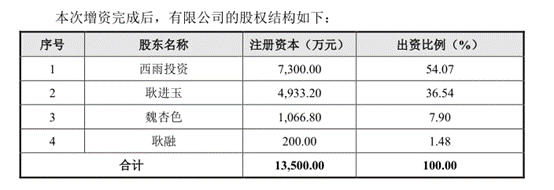 2016年2月,西雨投资以1元/注册资本的价格对雨中情进行了增资,而耿融以24.5元/注册资本的价格对雨中情进行了增资。增资完成后,雨中情的持股比例如下: