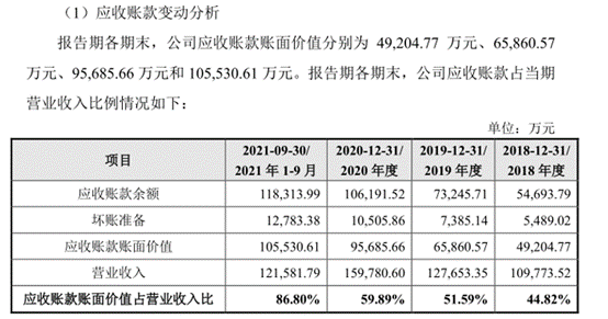 招股说明书显示,截至2018年末、2019年末、2020年末、2021年1-9月末,雨中情的应收账款余额分别为4.92亿元、6.59亿元、9.57亿元、10.55亿元,其中2018年至2020年雨中情应收账款的年均复合增长率为39.47%,特别是2021年9月末,雨中情更是拥有超过10亿元的应收账款悬顶。与此同时,报告期内,雨中情的坏账准备金额分别为5489.02万元、7385.14万元、10505.86万元、12783.38万元,已超过亿元。