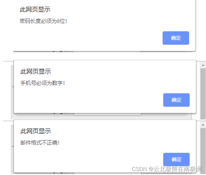 - 当用户单击“注册”按钮时,读取用户的姓名、学号、性别、住址和爱好信息,然后使用确认消息对话框显示这些信息,并提示用户是否继续提交,见图3;(不能通过元素事件属性绑定事件处理函数)