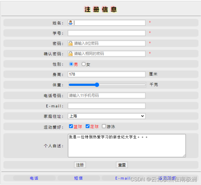 - 当用户填写非空白用户名、学号和密码后,将输入域后的星号变为灰色,如果用户清除输入域内容,则再将星号变为红色,见图2;(可通过元素事件属性绑定)