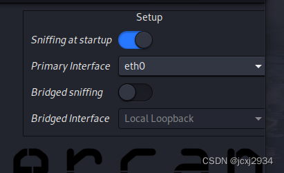 开启嗅探Sniffing at startup选择网卡Primary interface是否开启桥接模式Bridged sniffing桥接模式下的网卡Bridged interface