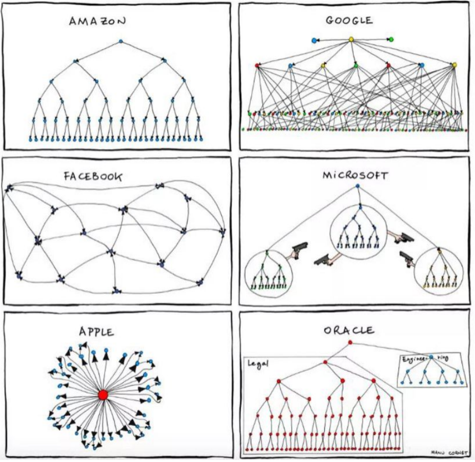 纳德拉印象很深的就是一位漫画师在2011年画的一组美国各大科技公司的组织结构图,在这幅图里,亚马逊等级森严但有序;谷歌主体结构清晰,但产品和部门之间相互交错混乱;Facebook架构分散,就像一张散开的网络;苹果一个人说了算;庞大的甲骨文,法务部比工程部门显得更重要。