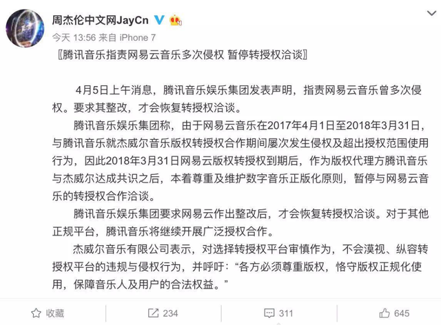 而腾讯给出的断供理由是“网易云音乐多次侵权”,周杰伦官方微博账号也转发了腾讯音乐的声明。