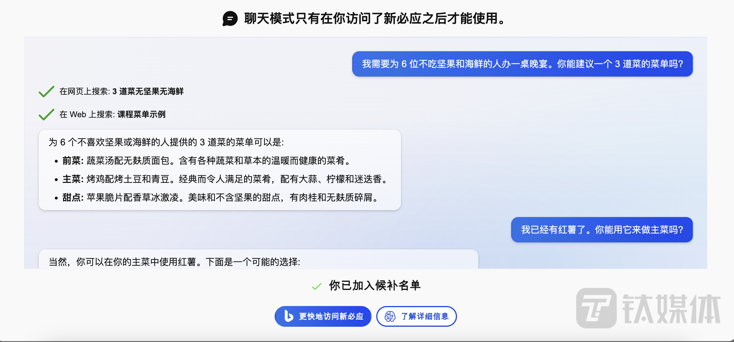 根据微软的说法,该公司预计在未来几周内向数百万人推出访问权限,并推出该体验的移动版本。根据常见问题解答,当你通过候补名单并可以访问新的聊天体验时,您会收到一封电子邮件,即成功体验新必应搜索。