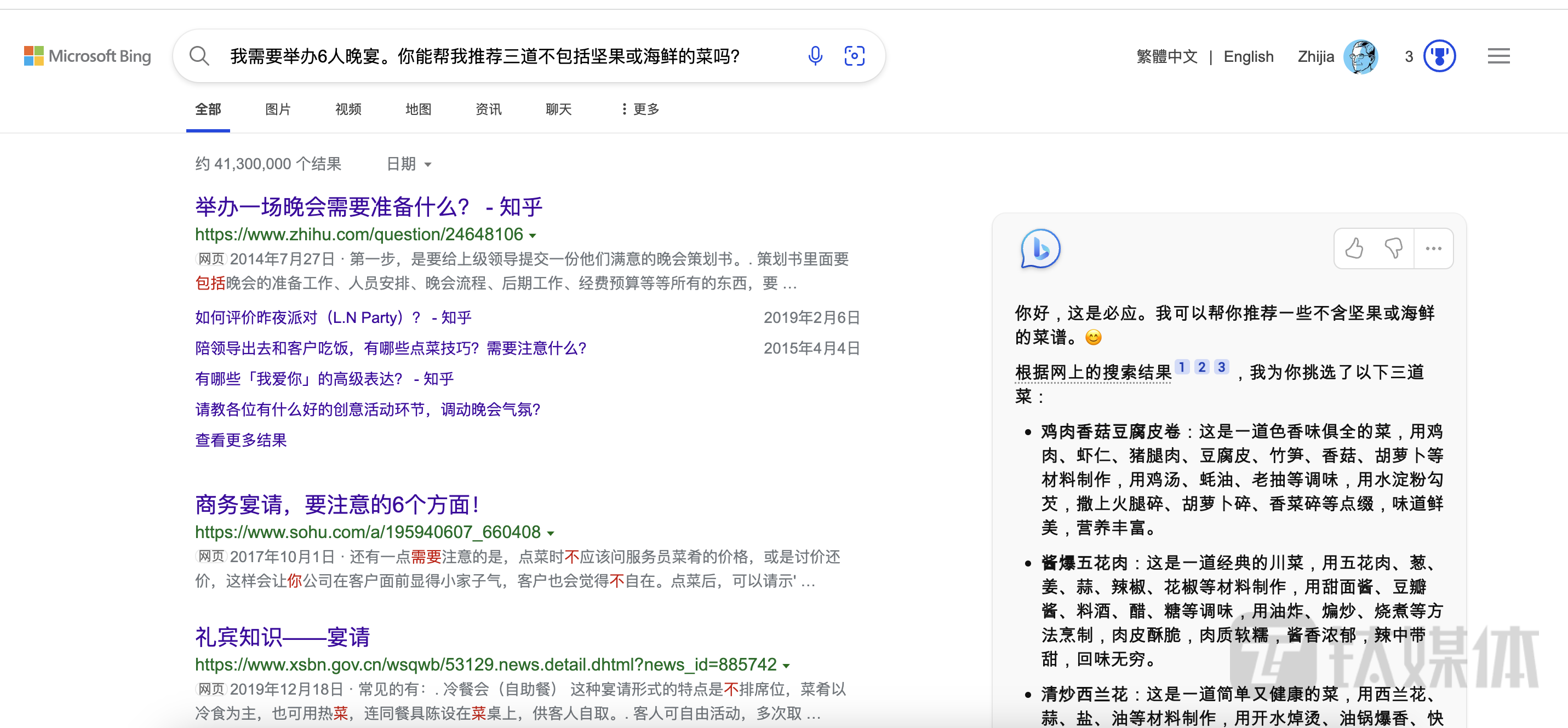 左侧是必应正常的搜索结果,右侧是 AI 版必应搜索答案
