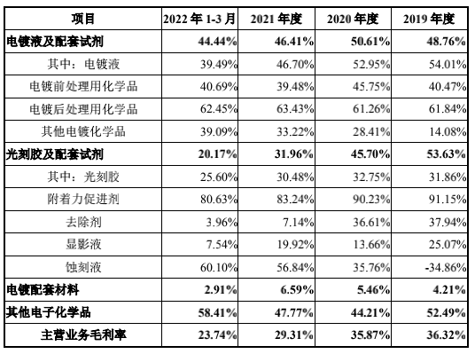 分业务板块看,钛媒体APP注意到,艾森股份主营业务中的光刻胶及配套试剂毛利率变动幅度较大。报告期各期,公司光刻胶及配套试剂毛利率分别为53.63%、45.7%、 31.96%和 20.17%。其中,去除剂的变动尤为显著。对此,艾森股份在招股书中称,去除剂类产品的主要原材料之一N-甲基吡咯烷酮在2021 年价格快速上涨, 对公司去胶液、清洗液类等主要产品的利润形成一定挤压,导致收入增长较快的去除剂类产品的毛利率大幅下降,由 2020 年的 36.61%下降至 2021 年的 7.14%。