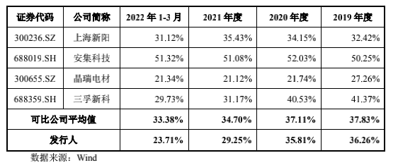 此外,艾森股份毛利率相较上海新阳、安集科技以及晶瑞电材等国内同行可比上市公司不仅波动颇为明显,而且报告期各期水平始终低于行业可比公司平均值,且差距在不断拉大。截至2022年一季度,艾森股份毛利率水平已经比行业平均水平低了近10个百分点。
