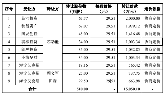 值得注意的是,在公司申报科创板前一年,公司遭遇第二大股东芯动能减持。据招股书,2021年6月,芯动能将持有的305万股股份以29.51元/股的价格转让给了芯沛投资、秋晟资产、国发创投、赛橡投资、朗玛投资、小橡呈财、海宁艾克斯,转让价款合计9000.55万元。同年11月,芯动能再次将其持有的艾森股份67.77万股股份以2000万元的价格转让给南通中金启江,本次股权转让价格同样为29.51元/股。